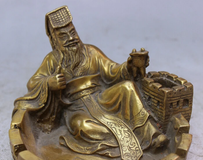 HIGH QUALITY S4985 Chinese Brass Happy Qin Shi Huang Hold Cup Overlie Great Wall Statue Ashtray D0317
