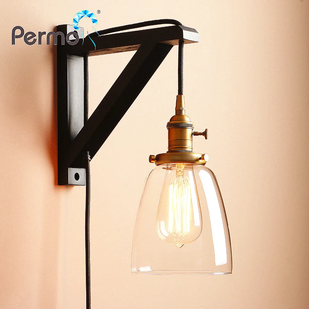 Review Top Permo Handmade Wooden Lamp Hook Wall Sconce Light Vintage Glass Wall Lamp With Wood Stand Loft Ligh