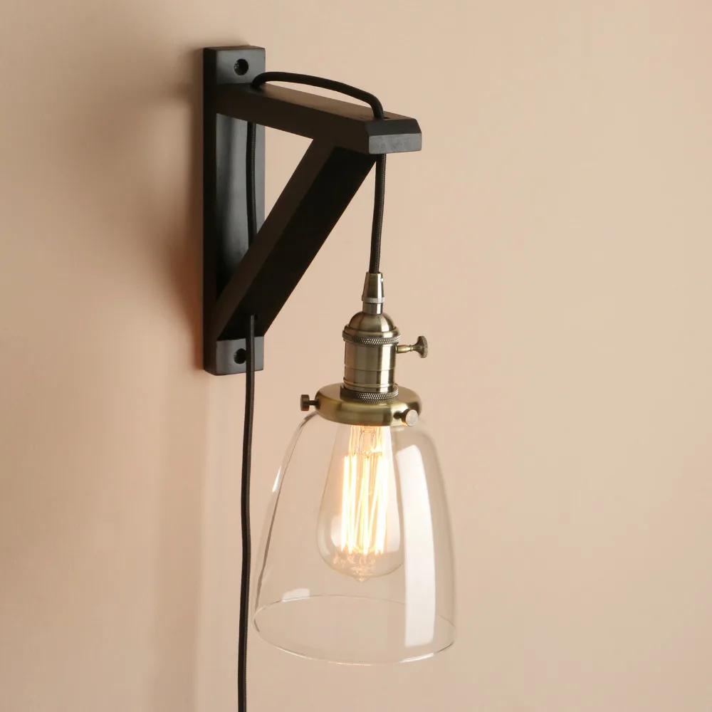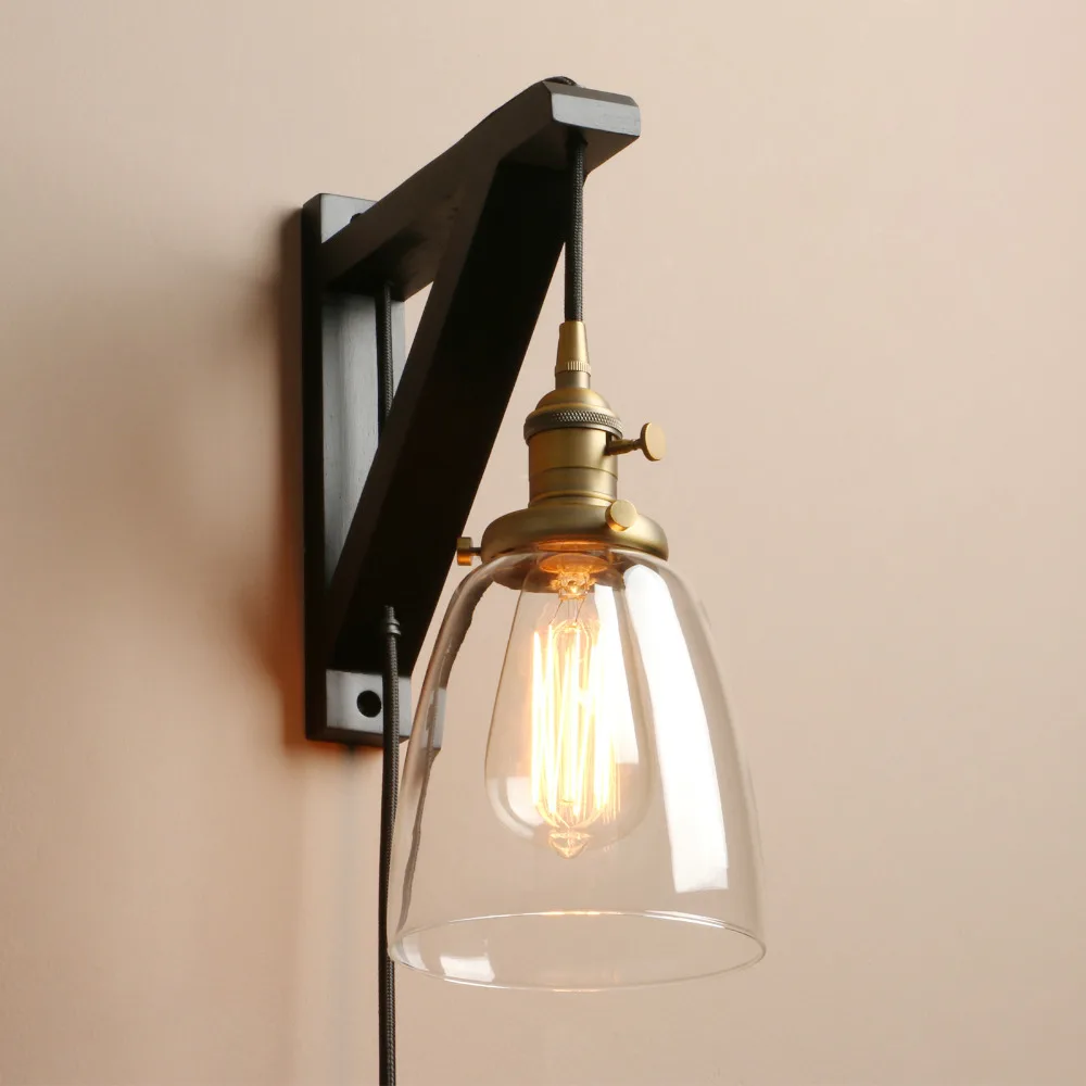 Permo Handmade Wooden Lamp Hook Wall Sconce Light Vintage Glass Wall Lamp With Wood Stand Loft Ligh